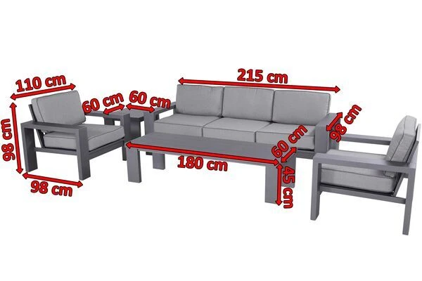 Im Lieferumfang erhalten Sie erhalten Sie zwei Sessel (ca. 110 x 98 x 98 cm), ein 3er Sofa (ca. 215 x 98 x 98 cm), einen Loungetisch (ca. 180 x 60 x 45 cm) und einen Beistelltisch (ca. 60 x 60 x 50 cm). Die Lounge bietet also genügend Platz für 5 Personen und verfügt mit den beiden Tischen über ausreichend Abstellfläche. Die Möbel können Sie individuell nach Ihrem Geschmack zu einem harmonischen Gesamtbild zusammenstellen. Zum Schutz Ihrer Terrasse sind die Möbel zusätzlich mit Fußkappen ausgestattet, welche unschöne Kratzer vermeiden.