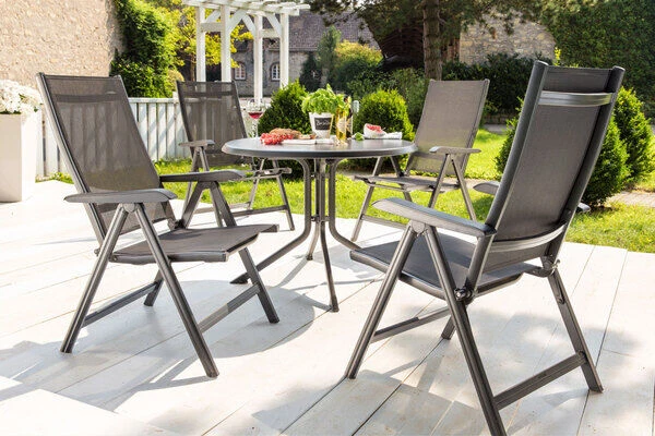 Mit dem Multipositionssessel aus der BasicPlus Serie bequem durch den Sommer. Mittels Rasterschiene lässt sich der Sessel leicht in 4 verschiedene Positionen bringen – so wird der Komfort eines Liegestuhls direkt integriert. Das solide und formschöne Gestell besteht aus edlem, anthrazitfarbenem Aluminium. Die ebenfalls anthrazitfarbene Sitzfläche wird aus wasserdurchlässigem, hochwertigem Outdoorgewebe gefertigt. Die Sitzfläche nimmt kein Wasser auf und trocknet schnell, so können Sie auch nach einem kleinen Regenschauer rasch wieder Platz nehmen. Das luftige Gewebe ist formstabil und trotzdem sehr bequem und zusätzlich UV- und sonnenölbeständig – insgesamt also der perfekte Begleiter in Ihrem Garten. Dank der leichten Materialien und des Klappmechanismus lässt sich der Stuhl leicht zu handhaben – wenn er nicht benötigt wird können Sie ihn platzsparend verstauen.