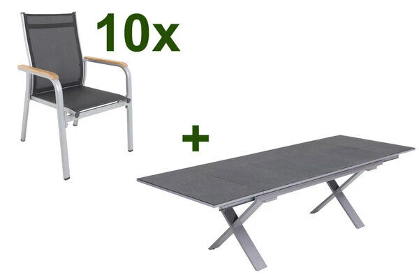 KETTLER Granada Esstischgarnitur aus Aluminium/Textilene, Silber, OUTFLEXX Ausziehtisch 180/280x100x78cm und 10 Stapelsessel mit Armlehnen aus FSC®-Teakholz