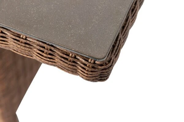 Das Untergestell des Möbelstücks besteht aus pulverbeschichtetem Aluminium, dies macht es nicht nur stabil, sondern sorgt auch dafür, dass es sich aufgrund des relativ geringen Gewichts von ca. 42,8 kg leicht hin und her stellen lässt. Das Aluminiumgestell wird mit Polyrattangeflecht bespannt. Das runde Geflecht ist in der Farbe hellbraun (Faser w18, Nature Exclusive Line) gehalten und der natürlichen Rattan-Faser nachempfunden – dies sorgt für einen sehr natürlichen und mediterranen Look. So passt diese Line wunderbar zu allen möglichen Terrasseneinrichtungen.