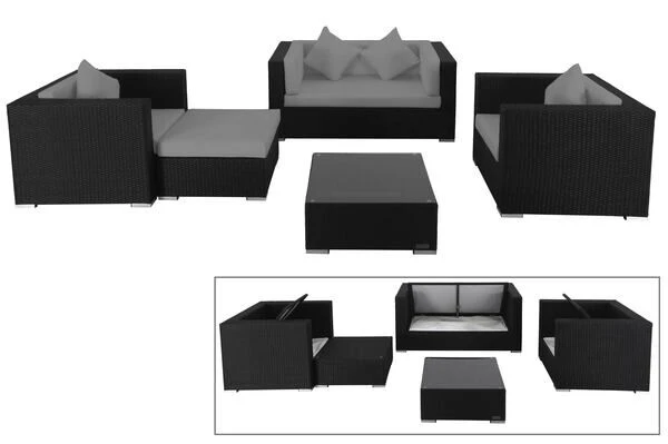 Polyrattan-Sitzgruppe mit Kissenboxfunktion in schwarz für 5 Personen