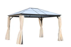 Mit einem Gewicht von ca.117 kg ist sie besonders stabil, die Höhe von ca. 248 cm sorgt dafür, dass man sich bequem aufrecht bewegen kann. Edelstahlschraubverbindungen fördern zusätzlich die Stabilität der Pergola.