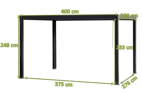 Durch einfaches Kurbeln kann das Dach geöffnet oder geschlossen werden, so dass je nach Bedarf über Schatten- und Sonnenplätze entschieden werden kann. Die Pergola mit den Abmessungen von ca. 400 x 300 x 248 cm, ist aus pulverbeschichtetem Aluminium gefertigt und in dezentem anthrazit matt gehalten. Ein Dach in der Farbe OUTFLEXX® anthrazit matt ergänzt das zeitlose Design. Dieses ist aus pulverbeschichtetem Aluminium gefertigt. Die verwendeten hochwertigen Materialien und deren Verarbeitung sorgen dafür, dass die Pergola besonders strapazierfähig und witterungsbeständig ist.