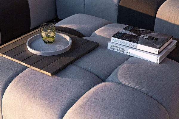 Das Obermaterial dieser Loungegarnitur besteht aus hochwertigem Sunbrella Textilen (260g/m²). Das Basismaterial von Sunbrella ist spinndüsengefärbtes Acryl, bei dem bereits bei der Herstellung Farbpigmente in die Faser eingebettet werden. Dadurch ist das Gewebe UV-beständig und trotzt Wind- und Wettereinflüssen. Durch ihre absolute Wetterfestigkeit können Sie die Loungemöbel ganzjährig ohne Schutz auf Ihrer Terrasse stehen lassen – und auch verschüttete Getränke oder dreckige Schuhe machen dem Stoff nichts aus. Auch in puncto Farbechtheit unterscheidet sich Sunbrella vom klassischen Textilgewebe, die Farbe sieht auch nach Jahren in Gebrauch noch aus wie neu. Außerdem weist der Stoff atmungsaktive, schmutzabweisende und schimmelbeständige Eigenschaften auf, weshalb er sich hervorragend für den Innen- und Außenbereich eignet. Das Innere des Polsters besteht aus besonderem Schaumstoff – dem „Quick Dry Foam“. Dieses Material verfügt über eine offenporige Zellstruktur, welche mit der Funktion einer Drainage vergleichbar ist. Eingedrungenes Wasser kann ungehindert austreten und unangenehme Gerüche sowie Schimmelbildung werden vermieden. Je nach Beanspruchung und Umwelteinflüssen empfehlen wir, die Sunbrella Möbel einmal im Monat mit einem Wasserschlauch oder einer sanften Bürste von oberflächlichen Verschmutzungen zu befreien. Pflege- und Reinigungsmittel mit denen Sie Ihre kostbaren Möbel vor Dreck schützen können finden Sie im Zubehör. Die Loungetische sind aus schwarzem, pulverbeschichtetem Aluminium gefertigt. Durch die pulverbeschichtete Aluminiumbeschichtung sind die Tische auch für den Einsatz draußen das ganze Jahr über geeignet.