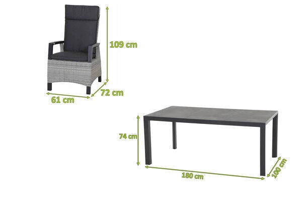 | Hohe Qualität Das verwendete Aluminium wurde durch eine anthrazitfarbene Pulverbeschichtung veredelt und die Keramik Tischplatte zeichnet sich durch seine robusten Materialeigenschaften aus. Dank dieser Materialkombination sind die Möbel weitestgehend witterungsbeständig und außerdem lichtecht und äußerst pflegeleicht. |