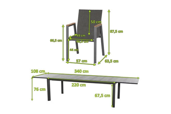 Wer in größeren Dimensionen denkt ist mit diesem Tisch bestens bedient. Der Tisch bietet mit seiner rechteckigen Form und Maßen von ca. 220/340 x 108 x 76 cm Platz für einen gemütlichen Nachmittag mit Ihrer Familie in der Sonne. Der Tisch lässt sich durch Ziehen an beiden Seiten und Hochklappen der integrierten, mittleren Tischplatte bis auf eine Länge von ca. 340 cm ausziehen – perfekt, wenn sich noch spontaner Besuch ankündigt oder Sie einen schönen Grillabend mit Freunden und Nachbarn planen. Das Gestell wurde aus pulverbeschichtetem Aluminium in matt graphit hergestellt, was den Tisch besonders haltbar macht. Die Tischplatte in Woodlook besteht aus hochwertigem Glas das mit Keramikpulver beschichtet wurde und besitzt eine Stärke von ca. 10 mm. Die quadratisch geformten Tischbeine sorgen für ein weiteres optisches Highlight. Die Fußkappen bestehen aus schwarzem Kunststoff und schützen den Boden vor unschönen Kratzern beim Verrücken des Möbelstücks. Die Unterschubhöhe beträgt ca. 65,5 cm – so kann man gemütlich mit vielen Arten von Sesseln und Stühlen an diesem Tisch Platz nehmen. Der Tisch hat ein Gewicht von ca. 73 kg, und ist somit perfekt gegen unerwartete Windstöße geschützt.