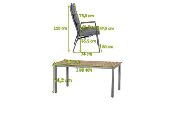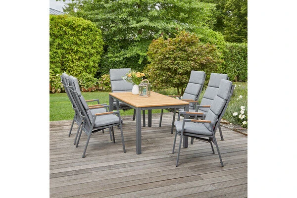 SIENA GARDEN Savona/Geneva Esstischgarnitur, graphit/grau, Alu/Teak/Texfabric, Tisch 160×90 cm, 6 Stapelsessel