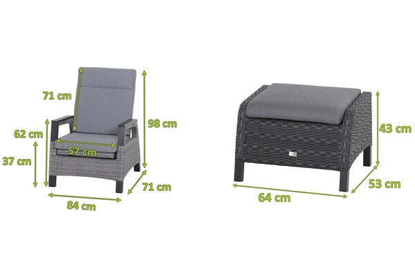 Gönnen Sie sich ein wenig Luxus in Ihrem Alltag und verbringen Sie in gepflegter Atmosphäre den Tag auf Ihrer Terrasse: bei einem leckeren Frühstück, bei einem genüsslichen Brunch oder lassen Sie bei einem Abendessen den Tag in geselliger Runde ausklingen. Das Set, bestehend aus einem Sessel und dem dazu passenden Fußhocker, lädt Sie und Ihre Gäste jederzeit zum Zurücklehnen und Verweilen ein. Der bequeme Stoff der Rückenlehne ermöglicht ein müheloses Entspannen. Der Sessel hat ein Gesamtmaß von ca. 71 x 84 x 98 cm. Die ca. 57 cm breite Sitzfläche bietet genügend Platz. Mit einer großzügigen Sitztiefe von ca. 56 cm und bei einer Sitzhöhe von ca. 37 cm lässt es sich hier auch herrlich bei einem Nickerchen entschleunigen. Die praktischen Armlehnen in einer Höhe von ca. 62 cm bieten zusätzlichen Komfort und sind echte Hingucker. Passende Sitzpolster verleihen dem Sessel ein unvergleichliches Sitzerlebnis.