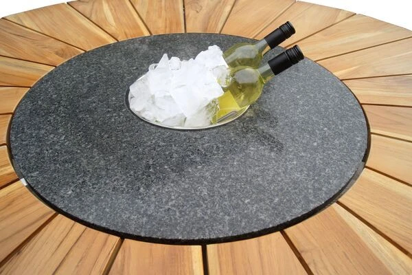 Die Besonderheit des Tisches liegt in der Funktionalität der Tischplatte, welche aus mehreren Komponenten besteht und für ein hohes Maß an Komfort sorgt. Die ca. Ø 170 cm große FSC®-zertifizierte Teakholztischplatte spendet genügend Platz für Teller, Gläser oder was sonst noch zu einem gemütlichen Grillabend mit der Familie gehört. Gewürze und Grillsoßen können auf dem ca. 46 cm breiten Granitring abgestellt werden. Dieser kann praktischerweise gedreht werden, sodass schwere Sachen nun nicht mehr quer über den Tisch gereicht werden müssen, sondern einfach und bequem zur anderen Seite des Tisches gedreht werden. Ein weiteres Highlight finden Sie in der Mitte der Tischplatte – eine eingefasste Edelstahlplatte kann bei Bedarf herausgenommen und durch den im Lieferumfang enthaltenen Eiskühler (ca. Ø 27 cm) ersetzt werden. So haben Sie ab sofort stets ein kühles Getränk zur Hand ohne dabei die gemütliche Runde verlassen zu müssen.