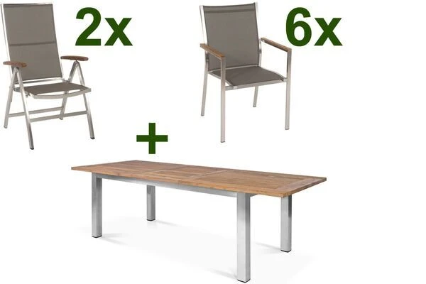 STERN Cardiff Esstischgruppe, silber/taupe, OUTFLEXX Ausziehtisch, silber/rustikal gebürstet, 6 Stapel-, 2 Multipositionssessel