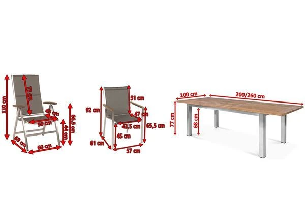 Die Kombination aus edlen, zeitlosen und rustikal, gemütlichen Elementen macht diese Esstischgruppe so besonders. Das Set besteht aus einem Ausziehtisch der Marke OUTFLEXX mit den Maßen von ca. 200/260 x 100 x 77 cm, 6 Stapel- und 2 Multipositionssesseln der Marke Stern aus der Serie „Cardiff“. Die hellen Farben des Gestells sind in Verbindung mit der Farbe des Teakholzes ein echter Hingucker und sorgen für eine zeitlose Frische. Dadurch lässt sich die Esstischgruppe wunderbar mit anderen Farben kombinieren. So bleibt Ihnen viel Raum für kreative Gestaltungsmöglichkeiten. Die hochwertigen Materialien und die sorgfältige Verarbeitung sorgen nicht nur für die besondere Optik dieser Esstischgruppe, sondern machen sie auch sehr stabil.