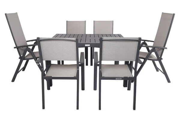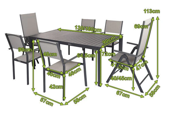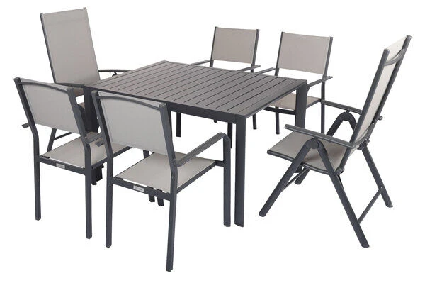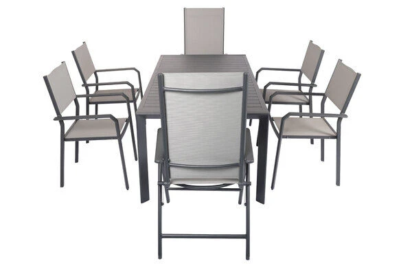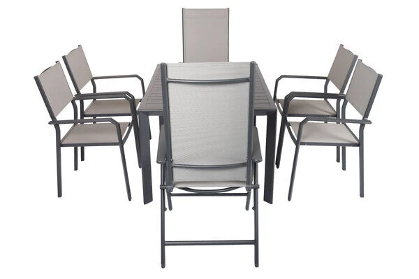 Diese Esstischgarnitur besteht aus einem Ausziehtisch, 4 bequemen Stapelstühlen und 2 Multipositionssessel – perfekt, für eine gemütliche Runde aus Freunden, Familie oder Nachbarn. Bei Bedarf können Sie diese Gruppe mit passenden Artikeln der VILLANA Serie erweitern. Je nach Sesseltyp können die Stühle entweder geklappt oder gestapelt werden – in jedem Fall kompakt verstaubar! Die praktischen Klappesessel haben Maße von jeweils ca. 67 x 58 x 113 cm und die Rückenlehne ist 8-fach verstellbar. Suchen Sie sich Ihre Lieblingsposition und vergessen den Alltag! Die Stapelstühle sind jeweils ca. 58 x 57 x 90 cm groß und schmeicheln neben Ihrer nützlichen Funktion, auch mit Ihrer moderne Optik! Die Sessel haben ein Gestell aus pulverbeschichtetem Aluminium in der Farbe Anthrazit. Aluminium ist ein gern verwendetes Material im Gartenmöbelsektor, da es besonders leicht, zeitgleich jedoch sehr stabil ist. Dazu kommt der geringe Pflegeaufwand durch die Pulverbeschichtung. Die meisten Verschmutzungen lassen sich unkompliziert mit Wasser aufweichen und anschließend abspülen oder mit einem weichen Schwamm entfernen. Dazu sind die Stühle trotz geringem Gewicht besonders stabil und beeindruckt mit einer maximalen Belastbarkeit von ca. 160 kg. Dabei kommt der Komfort nicht zu kurz! Die Sitz- und Rückenfläche ist mit dem modernen Material Textilene (70% Polyvinylchlorid, 30% Polyester) in der Farbe Grau bespannt. Das Kunststoffgewebe zeichnet sich vor allem durch seine hohe Belastbarkeit und seinen hohen Komfort aus. Zudem ist es frost- und hitzebeständig, was zusammen mit der hohen Lichtbeständigkeit für eine lange Attraktivität Ihrer Sitzmöbel sorgt. Auch nimmt Textilene kaum Feuchtigkeit auf, so dass die Sitzfläche nach einem Regenschauer schnell wieder trocken ist.